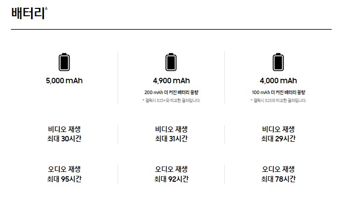 플러스는 배터리 용량이 갤럭시 s23과 비교했을 때 200 mAh 커졌음을 확인을 할 수 있습니다. 울트라와의 용량차이가 미미합니다. 그러나 기본형은 전 작보다는 용량이 100 mAh 더 커졌습니다.