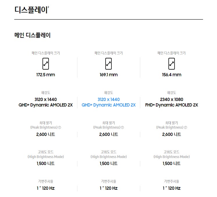 메인 디스플레이에서 울트라가 압도적으로 큼직한 크기를 자랑하고 있습니다. 해상도는 울트라와 플러스가 같은 성능으로 만들어져 눈여겨보아야겠습니다. 기본형은 해상도에서 약간 밀리는 것을 볼 수 있습니다.