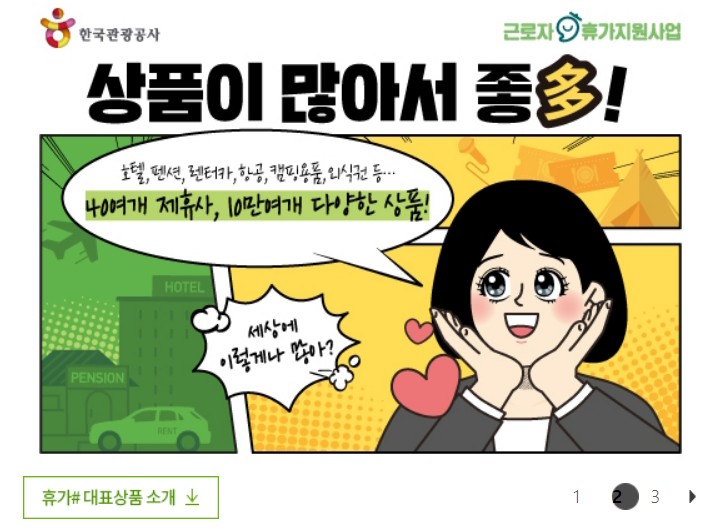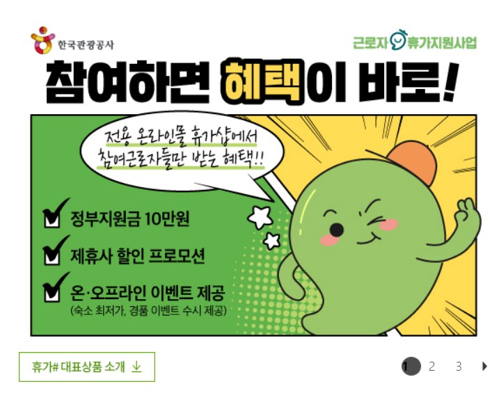 문화체육관광부와 한국관광공사에서 함께 기획했습니다. 근로자들을 위해 국내 여행경비를 지원하기로 사업을 추진했습니다. '근로자 휴가 지원 사업'에 참여를 원하는 기업과 근로자를 선착순으로 15만 명을 모집한다고 합니다.