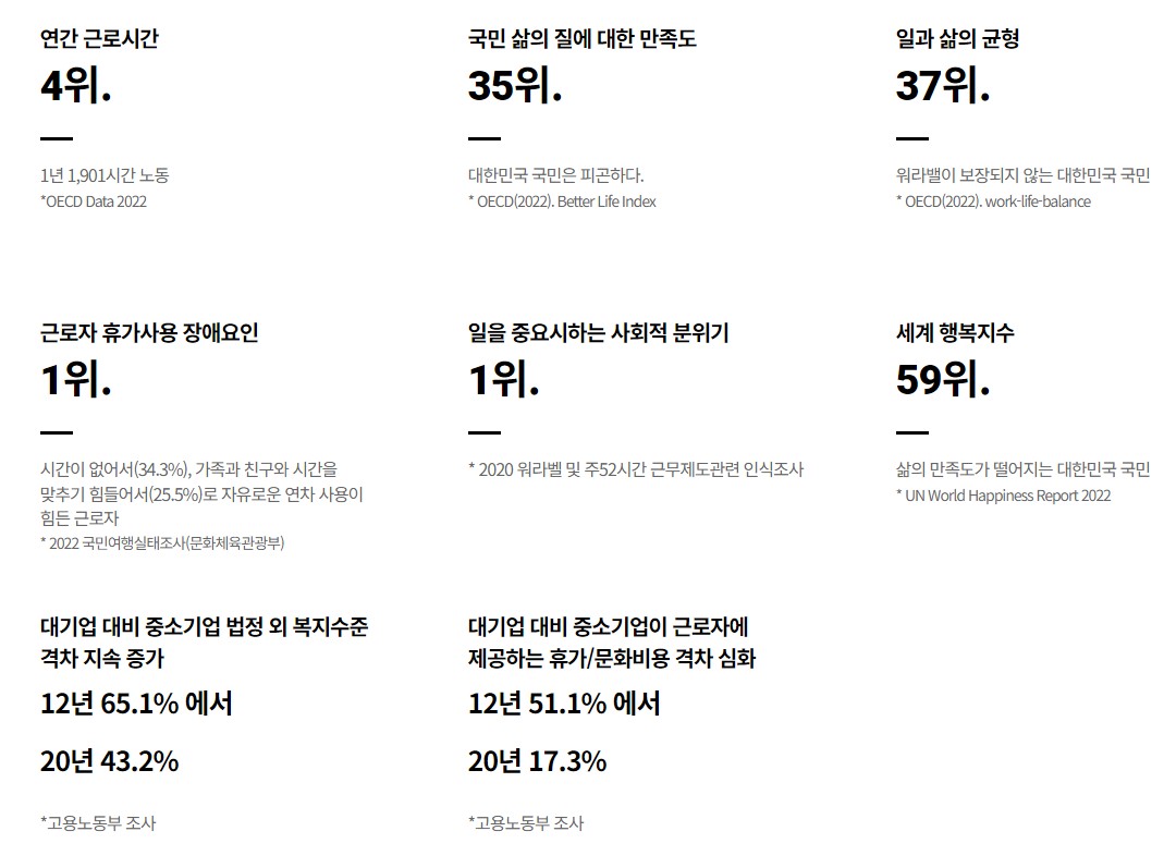 대한민국의 근로자는 OECD 국가 중에서 연간 근로시간이 1,901시간으로 세계 4위입니다. 삶의 질 만족도 조사에서도 세계 35위를 차지합니다. 일과 삶과의 균형이 보장되지 않는 환경에서 살아가고 있습니다.