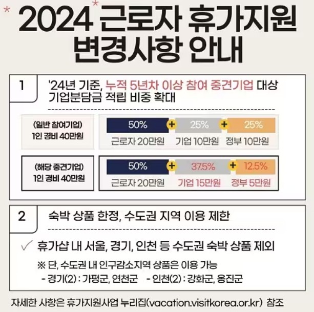 2024 근로자 휴가지원 변경사항을 안내드리겠습니다. 누적 5년 차 이상 중견기업의 기업 분담금 적립 비중이 확대되었습니다. 기존 25%인 기업 10만 원에서 >> 37.5% 기업 15만 원으로 인상되었고, 정부는 지원비중이 5만 원으로 축소되었습니다.