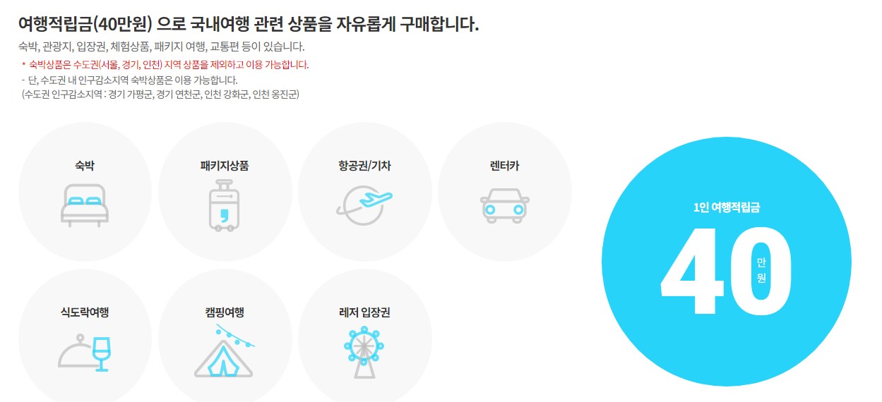 게다가 수도권 지역 이용 제한이 숙박 상품에 한정으로 적용됩니다. 서울 경기 지역을 제외하고 지역 경제를 살릴 수 있는 곳으로 여행 가셔서 지역의 소비활성화를 촉진시켜 달라는 의미로 해석이 됩니다.