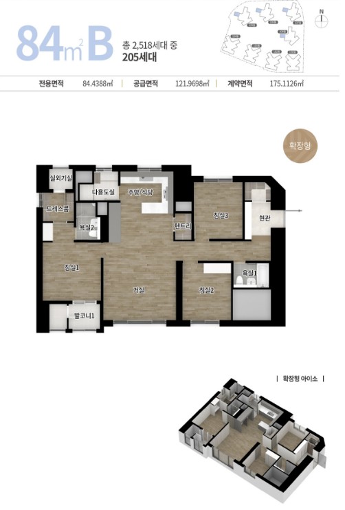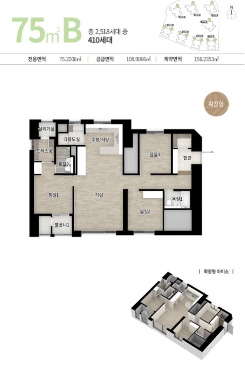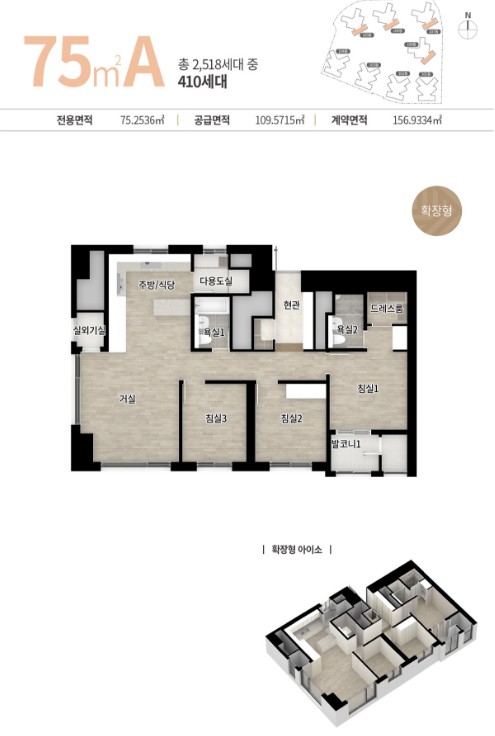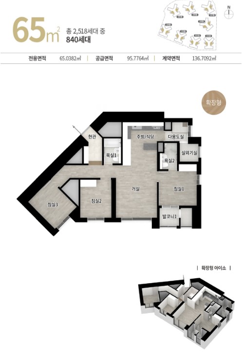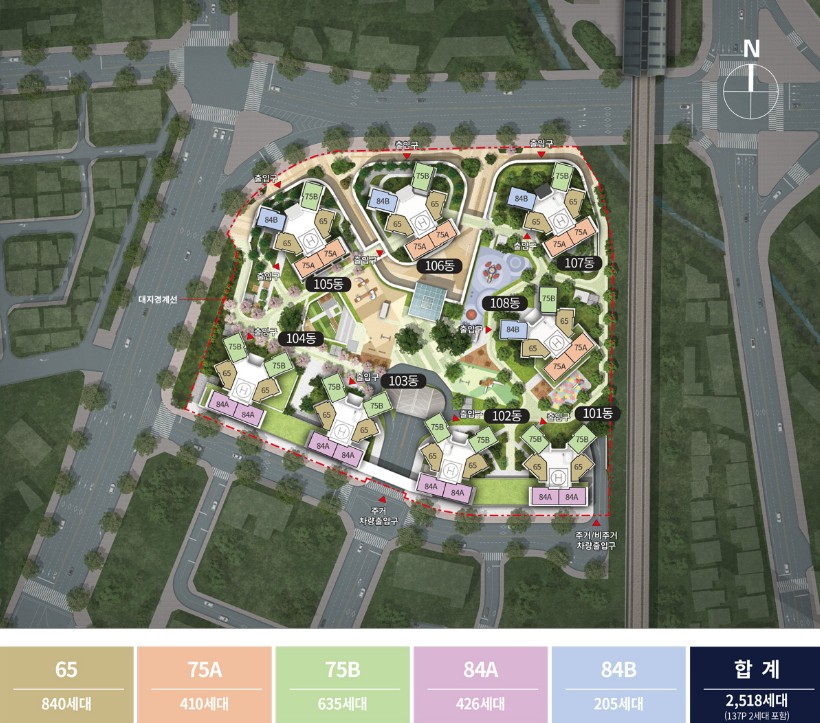 세대수 | 공동주택 총 2,518세대 (65 / 75 A,B / 84/ 137 ) 오피스텔 총 90실(89 /105 / 116 ) |