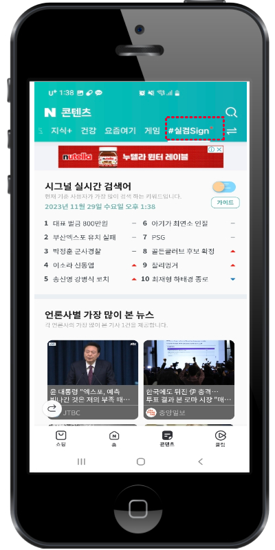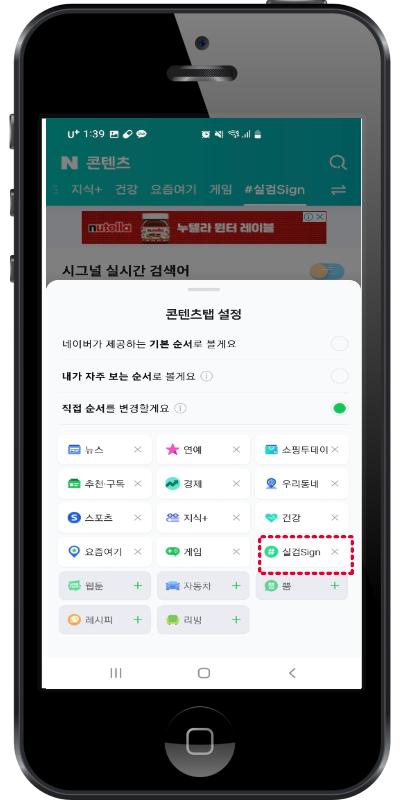 6. 콘텐츠탭 보는 순서를 변경하길 원하신다면 꾹- 눌러서 위로 옆으로 이동하여 주시면 되고요. 실검 Signal X를 눌러주시면 없어집니다. 참~ 쉽지요??? ㅋㅋㅋ