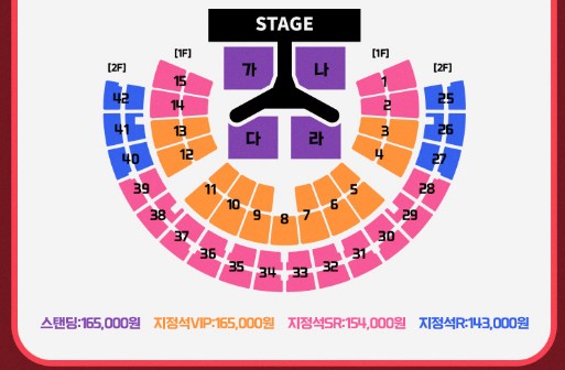분홍색 - 지정석 SR : 154,000원 - 선택 좌석에 앉아서 관람하는 구역