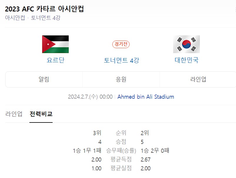 대한민국은 2월 7일 수요일 오전 0시에 카타르 알라이얀의 아흐마트 빈 알리 스타디움 경기장에서 4강전을 요르단과 경기가 예정되어 있습니다. 1960년 이후로 64년 만에 우승컵을 높이 들어 올릴 대한민국이 차근차근 여기까지 올라왔습니다.